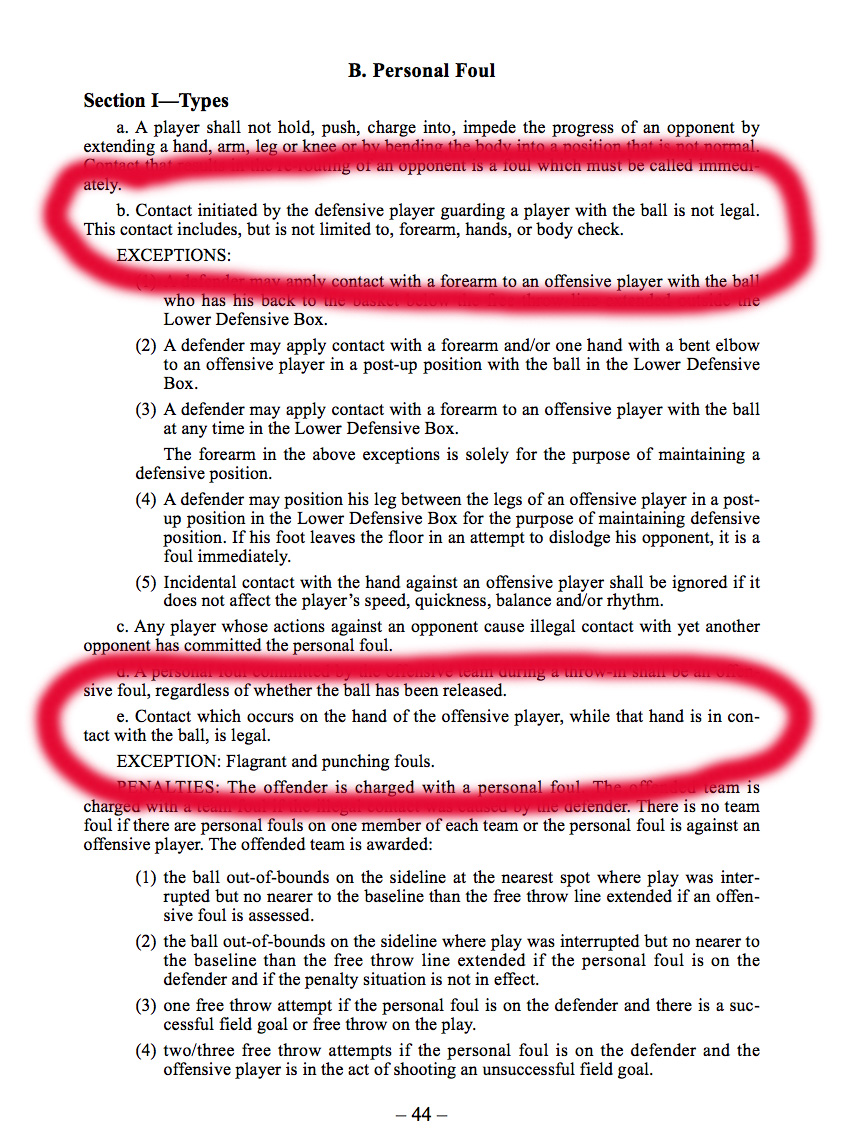Well, that’s confusing. It says that contact initiated by a defender guarding the player with the ball is not legal. Some exceptions are listed, but none that include “contact which occurs on the hand of the offensive player, while that hand is in contact with the ball, is legal.”