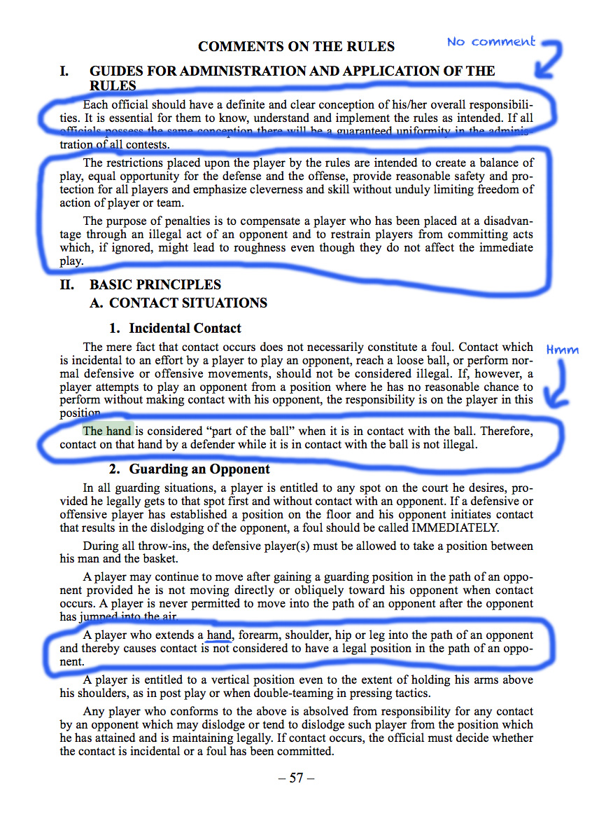 The “the hand is ‘part of the ball’” comment is listed under the “Incidental Contact” heading. To me, “incidental” is different from that which is “initiated by” the defender. If the rules are designed for player safety and to prevent roughness, how would hard “slap down” fouls (common around the basket and ALWAYS called as fouls) fall in line with that goal?